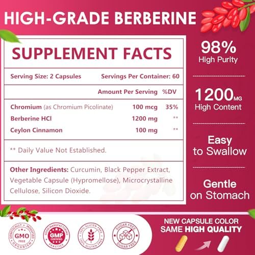 - HIGH PURITY & CONCENTRATION - Our high content 1200mg berberine with Ceylon Cinnamon helps activate AMPK enzyme, it can maximize energy levels & provide powerful antioxidant support to promote heart health. What's more, it helps improve brain cognitive function & support natural vitality.