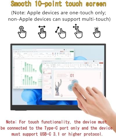 • 【Debes ver antes de comprar!!!】Nota: ① Los dispositivos Apple son solo de un toque; los dispositivos no Apple pueden soportar multi-toque;② La conexión HDMI no soporta la función táctil;③ Para la funcionalidad táctil, el dispositivo debe estar conectado solo al puerto Type-C y el dispositivo debe soportar el protocolo USB-C 3.1 o superior.