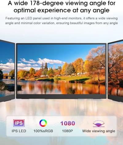 • 【Pantalla grande de 15.6” Full HD 1080P】Monitor móvil con ángulo de visión amplio de 178°, resolución 1920*1080 con contraste 1000:1, 300cd/m2 de brillo, relación de aspecto: 16:9 calidad de imagen impresionante y tecnología HDR, pantalla de gama de color 100% sRGB mediante “Usamos monitores LCD de pantalla IPS avanzados. Reduce eficazmente el daño causado por la radiación de luz azul, elimina el parpadeo y facilita la visualización durante largos períodos de tiempo!