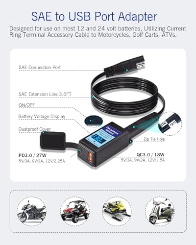 - Motorcycle USB Charger: equipped with SAE to SAE extension cable 1.1m(3.6 feet) and 5 zip ties. with 2-year warranty