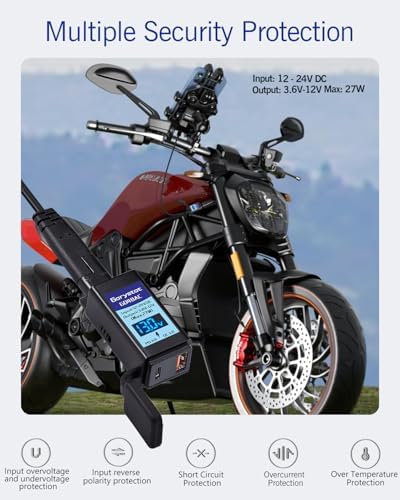 Motorcycle USB-C Charger, SAE to USB Adapter, 27W Dual Port USB Fast Charger with Voltmeter/Ammeter & ON/Off Switch, Perfect for Charging Phone, Tablet, GPS etc