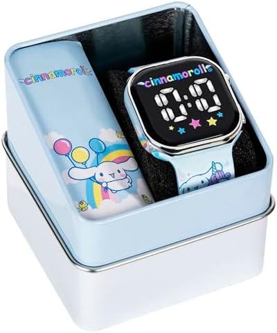 Delight your child with the Cinnamoroll Kids Watch, a perfect blend of fun, excitement, and practicality. This watch is designed to captivate young fans of Cinnamoroll, the adorable white puppy with long ears that allow him to fly, and a plump, curly tail that resembles a cinnamon roll. The delightful artwork and classic Cinnamoroll logo bring this beloved Sanrio character to life, making it a favorite accessory for kids who love cute and cuddly designs. The bright LED display is easy to read, helping children learn to tell time and develop good time management skills. Constructed with a durable square plastic case and vibrant Cinnamoroll artwork, this watch is built to withstand the rigors of daily wear. The printed plastic strap is not only comfortable but also showcases charming Cinnamoroll designs, making it a standout piece for any young fan. Safety is paramount, and this Cinnamoroll watch is crafted from child-safe materials, including a secure plastic buckle and keeper. Parents can have peace of mind knowing that their children are wearing a safe and durable accessory. Perfect for girls, the Cinnamoroll LED Watch comes attractively packaged in a collectible tin, making it a wonderful gift for any special occasion. Whether it's a birthday, holiday, or a reward for a job well done, this watch is sure to bring joy to any young Cinnamoroll enthusiast. Enhance your child's daily adventures with this exciting and functional watch that combines the charm of Cinnamoroll with the practicality of a quality timepiece.