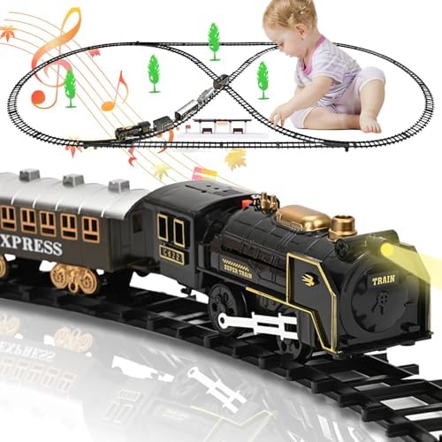 - Realistic Train Music & Light - The locomotive smoothly pulls passenger and freight cars along the track. This toy train includes 4 transfer tracks that can switch routes freely, increasing the fun of playing train toys, parents can tell the history of the Steam Age for children, lead the kids as if to return to the train era. The toy trains set are perfect for 3 4 5 years old boys girls kids as birthday and Christmas gifts.