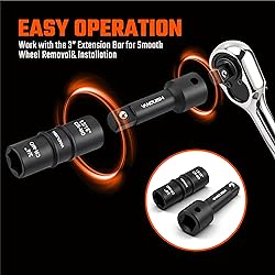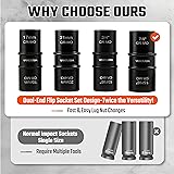Handle Lug Nuts with Ease: VANQUISH Motor Tech's 1/2" drive impact socket set is the solution for effortless lug nut removal and replacement. The set includes a 3" extension bar and the four most commonly used metric and SAE sockets: 17 & 19 mm, 21 & 22 mm, 3/4 & 13/16 in., 7/8 & 15/16 in. Seamless Work in Confined Spaces: Thanks to our thin-wall impact sockets, tight spaces become a breeze to navigate. The deep wells effortlessly handle long fasteners, ensuring smooth and hassle-free bolt removal. Firm & Protective Grip: Our 6-point sockets are meticulously designed to offer a secure and nonslip grip during lug nut removal and replacement, all while protecting your valuable fasteners from potential damage. Engineered for Lasting Use: Our lug nut flip sockets are expertly crafted from robust Cr-Mo steel and further blackened for superior strength & exceptional corrosion resistance, ensuring reliable performance for years to come. Effortless Organization: Easily locate the right socket with laser-etched size markings on each flip socket and the case itself. The provided blow-molded case simplifies transport and organization.