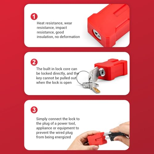 - 【Wide Applicability】 Simply attach the plug lock to the plug of any powered tool, appliance or equipment to prevent the corded plug from being powered on. This plug lockout device is designed specifically for electrical security and can be easily connected to the plug of power tools, appliances, or equipment, effectively preventing accidental power on of wired plugs