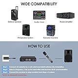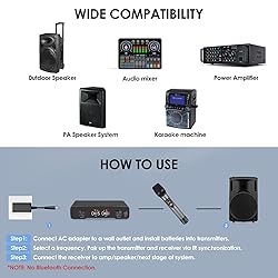 Plug and Play Automatic Pairing: The latest UHF wireless automatic pairing signal function is adopted. You can automatically pair by adjusting the frequency band wirelessly, without debugging, plug and play, effectively solving the problems of cross frequency and frequency hopping, and improving the anti-interference ability and reducing the interference between each channel, improving the stability of transmission. Wireless Microphone Set System: The UHF wireless handheld microphone is made of metal, and the receiver and microphone are durable and suitable for heavy use. The waist bag has an LED display function and is equipped with a head-mounted microphone. We give away 4 AA batteries for free. High-quality wireless transmission: There are 30 channels on the left and right. The microphone wireless system uses digital signal technology, not analog signal, no manual debugging, automatic pairing, and the line of sight of this microphone set is 290 feet - 328 feet, realizing long-distance operation. Professional wireless microphone: Omnidirectional microphone head and improved circuit design, the wireless system can capture sound and transmit smoothly without interruption, hissing or feedback, providing strong, clean and stable sound quality. Effectively eliminate environmental noise that omnidirectional microphones may pick up. Multi-purpose microphone set: a set of head-worn microphones, waist packs and dynamic handheld microphones to meet various needs. Wireless microphone suitable for singing, speeches, churches, weddings, meetings, DJ performances, etc. Package contents: Metal wireless handheld microphone * 1, handheld microphone rubber ring * 1, 47.24 (1.2m) cable length head-worn microphone * 1, power adapter * 1, waist pack * 1, waist pack short microphone * 1, 4 AA batteries, instruction manual * 1, 23.62in (60cm) 6.35 adapter * 1.