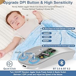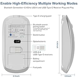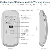 [2025 New Upgrade Enable High-Efficiency Multiple Working Modes]: 4 Modes Mouse(BT5.2 & BT3.0 + 2.4GHz USB-A & 2.4GHz USB-C [Type-C],Dual-port receiver with integrated USB-A and USB type-C,Kovess bluetooth wireless mouse realizes free switches between 2 devices in a wireless mouse only one switch. Simple & convenient to work from the desktop to the tablet, or laptop to Macbook, ect. Upgrade DPI button newly added jiggler mode feature. [More Advanced Bluetooth Technology and Dual-port 2-in-1 Receiver 2.4GHz USB-A and USB-C ]: Kovess bluetooth wireless mouse for macBook pro compatible with most system including PC,Notebook,Desktop,Pad,Laptop,mac OS; Support Win7/8/10/11 Linux OS X or Android Tablet.Wider application. [Upgrade Newly Added Jiggler Mode & Adjustable DPI]: Upgrade DPI button; Short press 1s to switch between 3 adjustable grade DIP levels optical accurately tracking mode (800DPI、1200DPI、1600DPI). Advanced optical tracking technology with quick click and responsiveness; Long Press 3s to Turn ON/OFF random jiggler mode(randomly move the mouse pointer irregularly). Preventing computer into sleep,keep screen active.suitable for Online video meeting、Downloading files、Game tasks、Online class、Online reading、Remote operation,etc. It keeps the computer active. [Super Comfort & Silent Click]: Ergonomic design with elegant profile,contoured shape, slim design. Naturally curved grip of this bluetooth wireless computer mouse keeps your hand comfortable. Smooth surface ensure maximum comfort and support for your hand even after long working hours. The rubber scroll wheel makes sure that your hand will not slip when scrolling. Responsive buttons provides very soft click with less noise, don't worry about disturbing others. Kovess bluetooth wireless mouse can meet your demand of daily office working and personal preference. [Rechargeable Optical Bluetooth Wireless Mouse and Hassle-free Services]: Kovess rechargeable bluetooth wireless mouse built-in durable 800mAh Li-polymer rechargeable battery, high cycle life, 2-4 hours full charge, lasting use time, work above 3-4 weeks, stand by for 90 days(Based on 8 hours average usage per day). If you do not use the mouse for eight minutes,It will go into sleep mode to save energy. Easily recharged through the included USB charging cable, No need to change the extra AAA battery, Eco-friendly and money-saving. Kovess bluetooth wireless mouse is enjoys 60 days money-back and 12-month worry-free warranty.