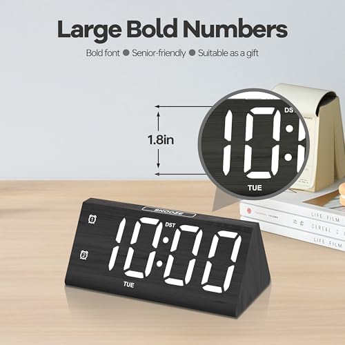 JALL Wooden Digital Alarm Clocks for Bedrooms, Large Bold Digits Electric Desk Clock, with Dual Alarm, USB Port, DST, Auto Dimmer for Wood Decor, Bedside, Gift (Black)