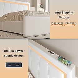 - Benevika Queen Bed Frame with 4 Storage Drawers and Adjustable Headboard, Upholstered Platform LED Bed with Type-C&USB Ports, Solid Wooden Slats Support, Faux Leather, Easy Assembly, White