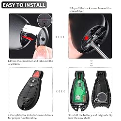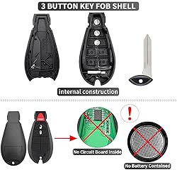 - Please Note: 1.Only car key fob shell and uncut key blade included, No electronics inside ( No remote / No battery / No transponder chip ). 2. We recommend that you refer to the installation video on YouTube for instructions on how to move the internal components to the new key fob case. 3. Please check your original key fob looks the same as the one in our product image before purchasing. Specification: Material: ABS Plastic + Zinc Alloy Color: Black Buttons: 3 Buttons: Size: 4.1 x 6.55 x 1.52 cm / 1.62 x 2.58 x 0.6 inches Easy Installation: No Programming Needed FCC ID: GQ4-53T Part Numbers: 56046953AG, 56046953AD, 56046953AC, 56046953AF, 56046953AE Compatible Models: Dodge Ram 1500 2013, Dodge Ram 1500 2014, Dodge Ram 1500 2015 Dodge Ram 1500 2016, Dodge Ram 1500 2017, Dodge Ram 1500 2018 Dodge Ram 1500 2019, Dodge Ram 1500 2020, Dodge Ram 1500 2021 Dodge Ram 2500 2013, Dodge Ram 2500 2014, Dodge Ram 2500 2015 Dodge Ram 2500 2016, Dodge Ram 2500 2017, Dodge Ram 2500 2018 Dodge Ram 3500 2013, Dodge Ram 3500 2014, Dodge Ram 3500 2015 Dodge Ram 3500 2016, Dodge Ram 3500 2017, Dodge Ram 3500 2018 Dodge Ram 4500 2013, Dodge Ram 4500 2014, Dodge Ram 4500 2015 Dodge Ram 4500 2016, Dodge Ram 4500 2017, Dodge Ram 4500 2018 Dodge Ram 5500 2013, Dodge Ram 5500 2014, Dodge Ram 5500 2015 Dodge Ram 5500 2016, Dodge Ram 5500 2017, Dodge Ram 5500 2018 Package Includes: 1 x 3 Button Key Fob Shell Replacement for Dodge ( with uncut key blade ) 1 x Key Chain 1 x Small Flat Head Screwdriver