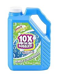 - Get ready for 10X the bubbles with Maxx Bubbles Bubble Concentrate! This 32 fl oz bottle makes up to 2.5 gallons of bubble solution, creating bigger, brighter, and bolder bubbles for endless fun. The vibrant formula works with all bubble toys - bubble machines, wands, blasters, and giant bubble makers - and is effortlessly easy to mix. Just combine 1 cup of concentrate with 9 cups of water for regular bubbles or 3 cups of water for giant bubbles. Designed with a no-mess, easy-pour handle, it’s perfect for quick refills. Whether it’s a pool party, picnic, or backyard playtime, this non-toxic, kid-safe solution helps you create unforgettable bubble moments for everyone!