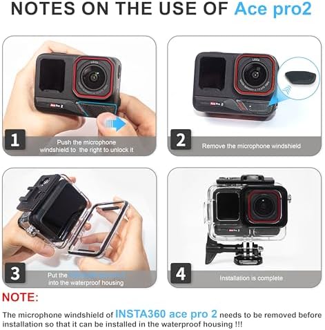 【Designed For】Insta360 Ace Pro2/Insta360 Ace Pro.(NOTE:NOT FOR Insta360 Ace!!!) 【Note】If used for Ace Pro2,please remove the windproof cover on the camera before installing it into this protective case. 【60M/196FT Waterproof】This waterproof housing case with upgraded waterproof sealing ring and tight buckle that help avoid water leakage effectively. You can use your camera to record underwater activity deep to 60 meters/196ft without worrying about leaks, and it also won't damage the shooting effect, clear and vivid. 【Excellent PMMA material】 Waterproof up to 60m//196FT, ideal for diving, surfing, snorkeling and other water sports activities. 【0.4" Bigger and 35% Thicker】Stronger than the standard's housing.Large Flat Glass Lens:delivers maximum image sharpness above and below water.