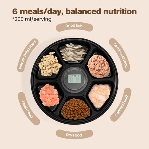 • Multiple Meal Supply: The wet food automatic feeder offers flexible feeding options with up to six meals settable. Each food compartment is independent, suitable for wet food, dry food, and small treats to satisfy various tastes. Cat feeder automatic is perfect for busy families and working professionals, you can choose immediate feeding or scheduled feeding, ensuring your pets eat on time even when you're away, maintaining healthy eating habits