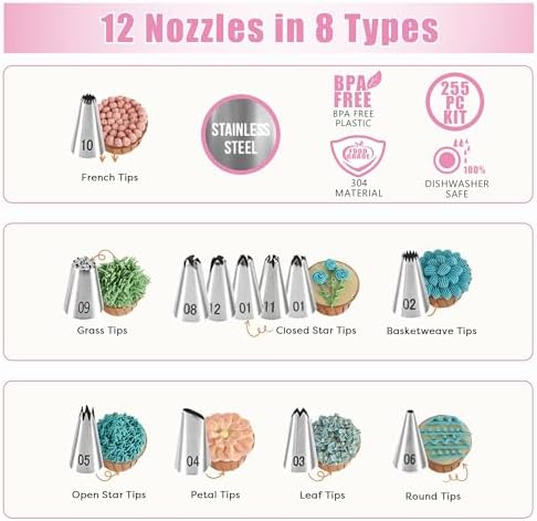 Cake Decorating Supplies Kit Tools 255pcs, Cake Decorating Set with Cake Turntable, 12 Numbered Icing Piping Tips, Cookie Cutters, Icing Smoother & Other Accessories for Cake Decoration (255 PCS)