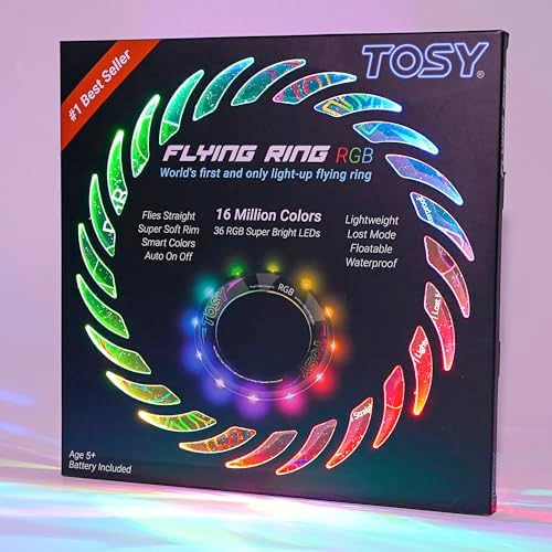 The world's first and only light-up Flying Ring guarantees endless fun for you and your loved ones!- Patent-pending design with 12 regular LEDs or 36 RGB LEDs creates impressive and beautiful light effects- The ring is well-balanced, flies straight, and it has extremely soft rim which makes throwing and catching so effortless and comfortable- Auto On/Off technology helps turn the lights on and off automatically to preserve the battery. The RGB version also offers various Color and Style modes for players to select easily - Our high-end Flying Ring is waterproof, floatable and very durable, you can enjoy throwing it anywhere: beach, pool, park, camping field...- Suitable for players of all ages and levels, kids and adults alike, the TOSY Flying Ring is a must-have toy for any fun outdoor activities and bonding experience. Plus, it makes the most special gift for many occasions.