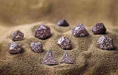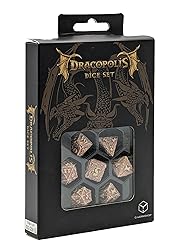 This product includes 7 items: D4, D6, D8, D10, D12, D20, and D100 The dice are made of resin with 3D carvings The material is hand-painted purple, like the scales of a winged serpent dragon found in the Yucatan area. The digits remain in a natural beige color The design shows leather wings, talons, scales, and other dragon features along the protruding legible digits The Dracopolis Dice Set: The Yucatan Featherwing is produced in Poland, EU