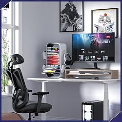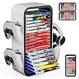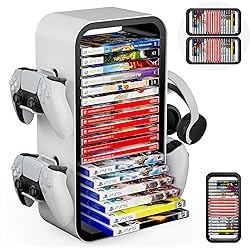 【Say Goodbye to Clutter】Keeps your games neatly arranged and easy to find. One tower can holds up to 19 discs. No more searching through piles of game discs! Make sure you have plenty of gaming space! and you'll never have to worry about losing your games again with this game holder. 【Vertical / Horizontal Stacked】 Game Storage Tower features dedicated slots for each disc, allowing you to quickly find and retrieve your favorite games whenever you want to play. Placed both vertically and horizontally, making it a suitable decoration on a table, TV stand, cabinet or any other flat surface. 【Excellent Compatibility】Compatible with Switch, PS4, PS5, Xbox One, and Xbox Series X / S games. Extra 4 holders available for controllers or headphones on both sides. The game storage tower is a must-have for video gamers, perfect as a holiday gift or birthday gift for your gaming fan friend. 【Stable and Sturdy】Made of high hardness ABS material, our game disc holder provides strong and stable support to prevent falling. It provides the most reliable and safe protection for fragile game discs and is a good partner for game cartridges. 【Easy to Assemble】With precise cutouts and interfaces, our video game organizer can be assembled in less than 2 minutes. You don't need to use extra tools and excessive time during the installation. No more dealing with clunky boxes - just pop the disc in the hole and slide it into place!