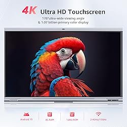 [65-Inch 4K Interactive Whiteboard] Fiteye 65-inch Smart whiteboard features an advanced octa-core processor (4 A73 + 4 A53), 4K UHD touch screen, 20-point multi-touch, 8s responding time and comes equipped with Android 13.0(128G RDM +8GB RAM). The powerful capacity ensure Fiteye Interactive Smart Whiteboard enjoyable and convenient experience. [Innovative digital whiteboard] Using the innovative S-Write feature of Fiteye interactive whiteboard, you can take notes and annotate on images or documents for better idea illustration. Easily erase with back of your hand. It supports graphic recognition and table insertion. Smart whiteboard function supports Airplay, Miracast and Chromcast mirroring from mobile devices. Smart split screen display. Scaning the QR code to take away. [Premium Video Conferencing] Built-in 4800MP auto-framing camera which provides a very clear video picture and automatically focus on the speaker during any Zoom sessions, 8 array microphones and also two 20W speakers that has clear as well as full sound and movie theater quality sound. Fiteye whiteboard seamlessly integrates with popular video conferencing platforms like Zoom, Google Meet, Microsoft Teams, and Webex, making remote collaboration more efficient. [Empowering Educational Tool] Transform classrooms into interactive learning spaces with our feature-packed smart board for classroom. Built-in educational tools such as Fiteye's whiteboard, S-Write, text recognition, and a variety of brushes enable educators to create captivating lessons that inspire and engage students of all ages. Better interactive experience with a smart pen.(Asin: B0DFHDZV3Z) [Open Apps Ecosystem] This interactive digital whiteboard Android 13.0 system allows to download and install the software you preferred in your work such as AutoCAD, CorelDRAW, Photoshop, Google Classroom, Figma, Illustrator to meet higher demands in more professional working process. All-in-one design, up to 9 device function Integration. It is an ideal solution for schools or business presentation.