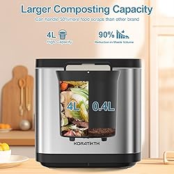 【🎧 2 YEARS AF_TER-SALE SERVICE】Koratikth Electric Composter comes with 2-years af_ter-sale service for any reason. If you need replacement parts, please reach out to us via your Amazon order detail page (Go to Your Orders>Problem with order>Contact Seller). We hope you can improve the living quality with our smart compost bin. 【♻️ Turn Your Home lnto A Climate Solution】Our food electric composter transforms food waste into powder with 6 blades which can easily cut small pieces of pig bones. It can help you keep your leftovers from being discarded in dump, minimize your carbon footprint, and spares you disposal costs while revitalizing your garden. Try to DIY your fertilizer by various food waste. 【♻️ 4L Larger Composting Capacity for Waste】Our electric composter bucket capacity is as large as 4L while others' is 2.5L, which can handle more food waste than others for 1-time. And it will takes more waste types than traditional composting and helps reduce food waste by up to 90%. Sturdy stainless steel casing ensures a longer service life than other plastic casing devices on the market. 【♻️ Odorless for Kitchen】Compared to traditional composting bins, our composting machine filters the odor produced by the food waste through the carbon filter into odourless, which do not attract insects. With two carbon filters which have an higher odor-absorbing capacity; Also, Lemon and other fragrance materials can be added to the small filter box to eliminate the odor and enhance the fragrance. 【♻️ Easy to Use with LED Display】Different from the composter operated by the single button, our composter has a visible operation panel and separate function buttons, which is simple and clear, easy to use even the elderly. It designs with an automatic weighing function for auto mode that estimates how much time it will take. The planning time and remaining time of the timer display can help us know the working time and remaining time; No need to record the time by ourself. 【♻️ Easy to Clean With Self-Cleaning Mode】Made of durable cast aluminum and nonstick coating which is easy to take on any type of food waste, and the bucket is easy to clean and is dishwasher safe. The self-cleaning function frees up your hands, you don't have to worry about cleaning. 【♻️ Matches The Other Major Appliances】The neutral factory color and sleekness eased that ocd and the product fits very well matching everything else and it looks really really SLEEK in the kitchen.