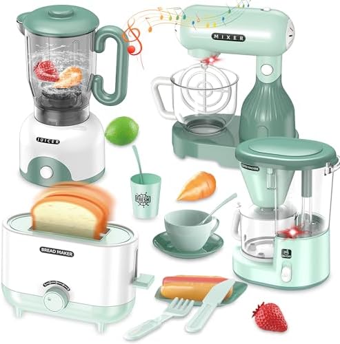 - Play Kitchen Set with Sound & Light: The toaster and blender produce sounds, while the coffee maker and mixer offer both sound and light. It's a good play kitchen set for kids aged 4 - 8. Each requires 2 or 3 AA batteries (not included)