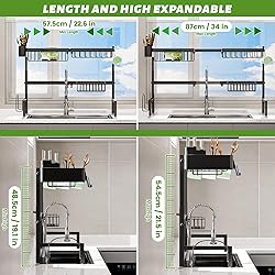 【Tips Before Purchase】Please carefully measure the length of your sink at first. Your Sink Length should be ≤34 inches and if beyond 34", please choose our other over sink dish racks. If there are cabinets over your sink, the vertical space above the sink should be at least 30 inches to place dinner plates. So please confirm your sink length and vertical space first before your order!!! 【Dimensions】23" - 34"(L) x 11"(W) x 19" - 21.5"(H). Extendable length 23 inches - 34 inches;Extendable height 19 inches - 21.5 inches. The length and Height can be adjusted by the short screws. (Please watch the attached video and you will easily understand the structure and installation steps) 【Material】High-quality metal covered with black Finish.