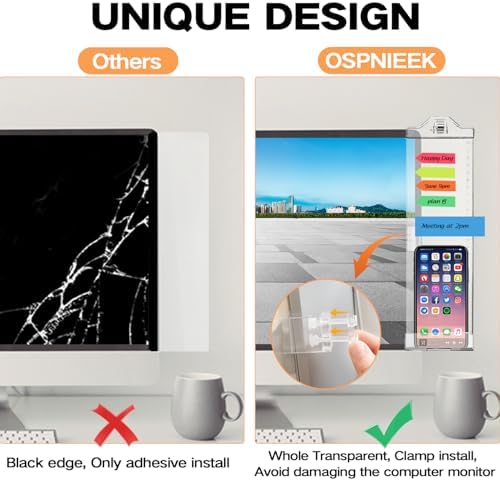 - [Super Practical]: Three areas, the upper area with a strong paper clip, can clip documents, the middle part can be pasted with notes, and the bottom can put your mobile phone, even design with a hole for convenient charging of your mobile phone. Use OSPNIEEK monitor memo boards, paste notes to be convenient to remind yourself to do things, record your work arrangements, meeting reminders and as your great daily notes