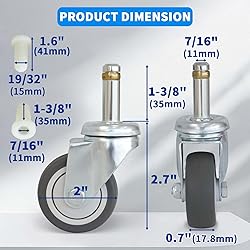 2 INCH CASTER 7/16 STEM: The rubber wheels are designed for durability and to prevent the steel ball bearings from loosening or falling out. Each creeper wheels has a load capacity of 125 lbs EASY INSTALLATION: Casters set of 4,grip ring stems measure 1-3/8 inches in length and 7/16 inches in diameter, equipped with 19/32-inch outer diameter plastic sockets for seamless and straightforward installation WIDE APPLICATION: Rubbermaid mop bucket wheels are widely used in shop vacs, shopping carts, mop and bucket sets, Weber grills, and tool carts QUITE SMOOTH: Appliance rollers with soft rubber and ball-bearing swivels, rolls silently and smoothly across various floors PLEASE NOTE: Replacement wheels installation raises height by 2.7 inches,please note the installation requirements
