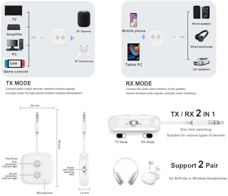 - [One-click switching for easy operation] Equipped with One-click convenient buttons. With just a simple operation on the adapter, you can one-click switch between TX/RX mode, one-to-two mode, pause/play music, skip to the next/previous track, increase/decrease volume, and power on/off. It's extremely convenient.