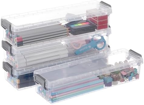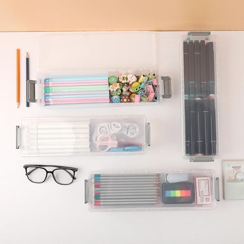 - Stackable & Portable Design- The clear pencil box features a stable stackable design, which maximizes space utilization and keeps your desktop neat and organized. The slim, space-efficient shape fits easily into most desks, drawers as well as backpacks and briefcases, lightweight and portable.