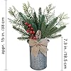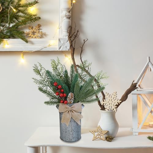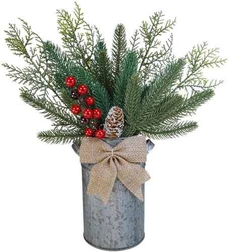 - Material: Artificial pine greenery and red berries made from plastic and foam. The metal flower vase is crafted from galvanized metal and adorned with a simple jute twine bow. Lightweight and sturdy, this low-maintenance farmhouse table centerpiece can be easily moved throughout your home. As an artificial arrangement, it requires no watering or care and will always maintain its festive appearance.