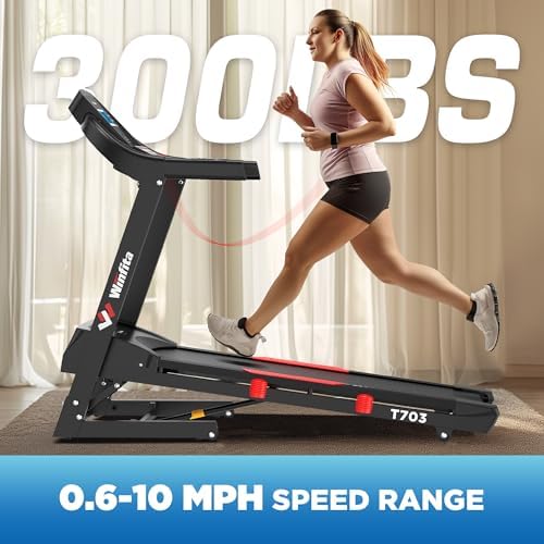 Discover the ultimate in home fitness with the Winfita Treadmill, designed to elevate your workout experience with its advanced features and user-friendly design. Engineered for versatility and convenience, the Winfita Treadmill combines cutting-edge technology with intuitive controls to cater to users of all fitness levels. This treadmills for home is arriving 99% pre-assembled. It only takes 10 minutes from unboxing to assembly, and only 6 screws are required to be tightened during the assembly process. Winfita treadmill can be controlled either through the treadmill console or via your smartphone. It supports 3 smart APP, providing seamless integration for a more interactive workout experience. The 5'' LED display keeps you informed with real-time data on speed, incline, time, distance, calories burned, and heart rate. With 64 preset programs, 5 user-defined options, and 3 countdown modes, you can easily tailor your workout. The 0-15% auto incline feature automatically adjusts during your workout to simulate different terrains, allowing you to intensify your workout and boost calorie burn. Powered by a 4.0HP motor, the treadmill operates smoothly and quietly, supporting speeds from 0.6 to 10 MPH and 300 LBS weight capacity. Whether you're walking or running, you can enjoy a steady workout. The compact and foldable design, along with transport wheels, makes it easy to move and store the treadmill. This is perfect for those customers with limited space. Key Features: Name: Winfita Incline Treadmill for Home Motor Power: Max. 4.0HP Speed Range: 0.6-10MPH Incline Range: 0-15%(8.5°) Weight Capacity: 300LBS Running Belt Size: 18"W x 50"L Unfolded Dimensions: 64"L x 28"W x 52"H Folding Dimensions: 43"L x 28"W x 55"H Features: Music Speakers, Water Bottle Holders, Tablet Holder Programs: 64 Preset Programs, 5 User-defined Programs, 3 Countdowns Modes