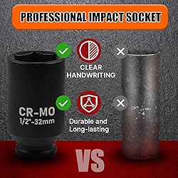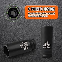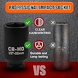 【Heavy-duty Material】: Professional-grade axle nut socket gives ultra-flexibility and tightness. All sockets are made of Chromium Molybdenum (CR-MO), with black phosphoric acid coating on each socket surface, which greater shatter-resistant, rust stains prevention than those made from CR-V steel. Each has highly visible laser-etched marking for easy identification even in low light conditions. 【6-Point Socket Design】: 6-point flank drive of 22mm socket for tight hold without damaging fastener corners. For easy removal of axle shaft nuts to meet your job requirements. 【Great Choice】: This 22mm impact socket 1/2 drive deep socket is ideal choice for any Home maintenance, Garage and Automobile repair, DIY home improvement. 【Highly compatible】:1/2-inch drive 22mm impact socket is made to work with a wide range of tools. 【High-quality Experience】:We have full confidence in our socket products and believe that they can improve your work efficiency and become a reliable assistant in your daily life.