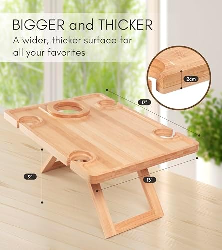 - Spacious 17" x 13" x 9" Tabletop Surface: With space for a wine bottle, four wine glasses, and shareable snacks, this compact Portable Wine Table makes it easy to enjoy charcuterie and drinks during beach days, park picnics, or backyard evenings.