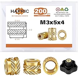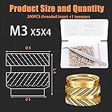 - Specifications: Material: Brass Quantity:200 x M3 threaded inserts,1 x tweezers Features: 1.M3 threaded insert set is made of sturdy brass and will not break and rust for long-term indoor and outdoor use. 2.The set contains a total of 200 threaded inserts, comes with tweezers to facilitate the use and storage of small-sized. The set is sufficient for most insert combinations and injection molding in daily life. 3.The heat set insert kit comes with a beautiful label box. There are labels inside and outside the box with corresponding sizes and quantities for easy search and storage.