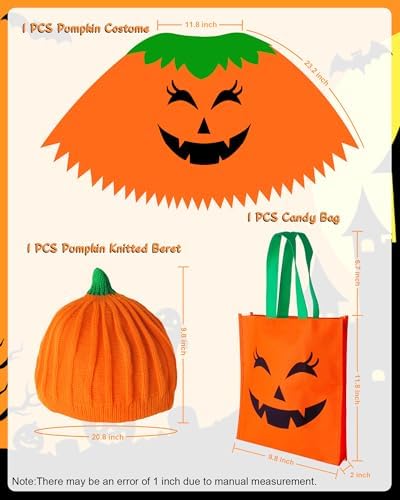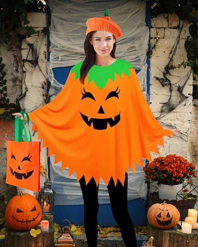 3 PCS Pumpkin Costume for Women Adults, Poncho With Beret and Candy Bag, Halloween Costume