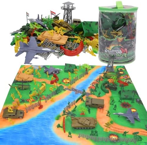 - Military Set with 150 Pcs Complete Accessories:Our military toy set includes 96 army soldier action figures,1 battle map, 2 tanks, 2 trucks, 2 helicopters, 2 transport planes, 1 motorcycle, 2 tents, 1 watchtower, 8 fences, 2 flags and other accessories.