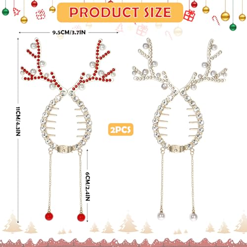 Amabro 2PCS Christmas Reindeer Ponytail Bun Holder, Bling Reindeer Banana Clips Rhinestone Pearl Hair Claw Clips Christmas Hair Accessories for Women Girls