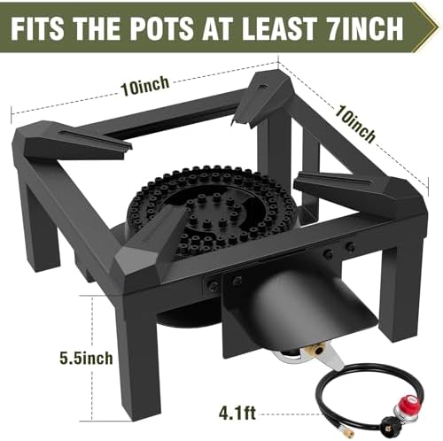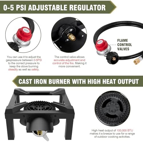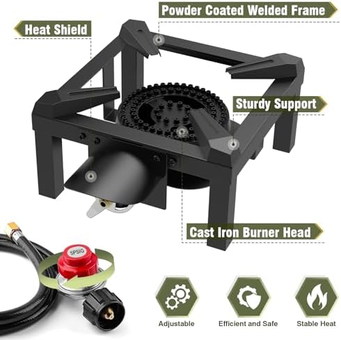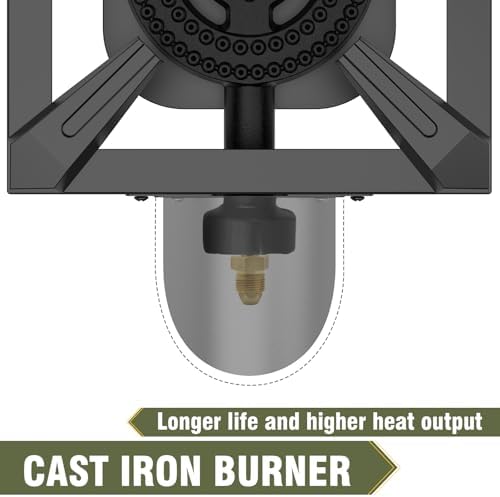 - Premium Quality Material: Portable propane burners for outdoor cooking, made of cast iron for durability. Our outdoor propane burner comes with a top heat shield that prevents oil spills and prevents flames from burning into the hose connections, and a bottom heat shield designed to protect parts and surfaces from heat damage and enhance thermal protection