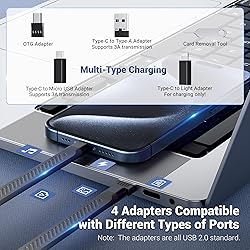 All In 1:This Cable Card combines the 3 functions of multifunctional USB Charging adapter case, SD/TF card reader, and memory card holder, allowing you to avoid having to fumble for the correct connector in chaos. Unique locking Knob design, more reassuring! High Speed SD Card Reader:Plug and play, compatible with UHS-II SD and TF flash cards, with transfer speeds up to 300MB/s (USB-C 3.1 Gen 2 cable). The dual card slot design supports simultaneous reading and writing of SD card and microSD card, with a maximum compatibility of 1TB storage card, allowing you to exchange photos or videos between your camera and phone while on the go, and share your travels in real-time! Multi Adapter Options:Include 4 different adapters: MicroUSB, Type-A, Light, OTG adapter, and also comes with a Type-C data cable. You can combine adapters according to your device to cope with emergency charging and data transfer (Note: The Light adapter is only used for charging and does not support connection with a card reader!) SD/TF Card Holder:The internal double-sided EVA card slots can accommodate 8 SD cards and 16 TF cards, meeting your card storage needs without worrying about memory cards sliding or accidentally falling off; Sturdy Aluminum Alloy Shell can provide a sense of security for internal memory cards.(Note:Not Include any memory cards!!) Safe Charging and Data Transfer:This Multi Charging Cable Case is designed to be compatible with various devices, including smartphones, tablets, digital cameras, PC, drones, etc. It ensures that you can easily provide charging data cables and data transmission for your devices while on the travel or outdoors.