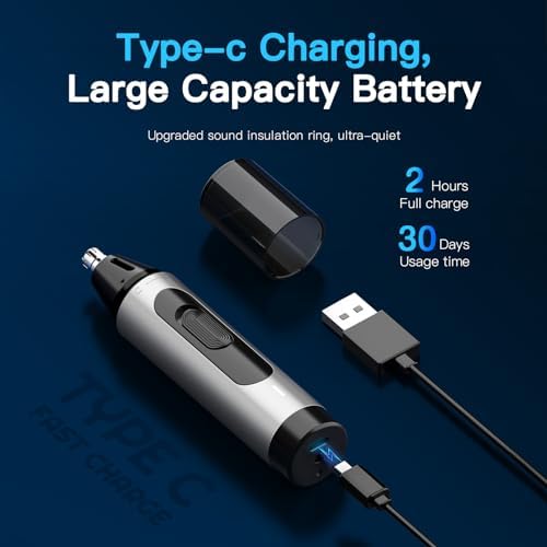 - ❤️【USB Rechargeable Nose Hair Trimmer and Travel-Friendly】 The ear hair trimmer for men can be quickly charged through the Type-C port. It takes only 2 hours to fully charge and can be used for about 1 month if used for 2 minutes a day. This nose hair clipper is conveniently portable, perfect for home use or travel. A USB charging cable ensures that you can charge the ear hair removal for men anywhere
