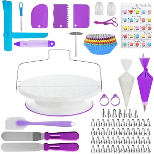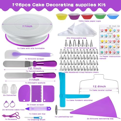 - 【Baking Kits for Adults】Complete cake decorating supplies kit includes 196 pcs baking tools, 48 decorating nozzles, 20 piping bags, cake turntable, spatulas, decorating pen, cake paper cups, and more – everything you need to start baking and decorating like a pro. Ideal for both beginners and experienced bakers, this cake baking kit makes a perfect gift for any occasion.