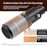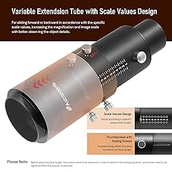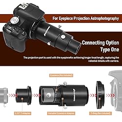 Simple to Use; also Ideal for Beginners: Provides a secure connection between your SLR camera and your telescope; it allows you to immediately start taking focal plane or eyepiece projection images Premium Material Design: Anodized aluminum construction is sturdy and solid; withstand daily wear over long period time of use; extend product's service life 34mm Scales Value on Variable Extension: Provides more precise adjustment; achieve to adjust focal length for increasing the magnification and getting the best beautiful photos of the Moon and planets Full Extinction Thread with Greater Load-bearing Performance: The inner wall extinction thread is fully covered which better eliminates the reflection of light during shooting; a thicker body provides greater stability Zooming into The Night Sky: Connect this adapter to each telescope with a 1.25" eyepiece connection; you can use an eyepiece of any focal length - and you can achieve high-magnification images of lunar craters and planets - without needing to change your eyepiece