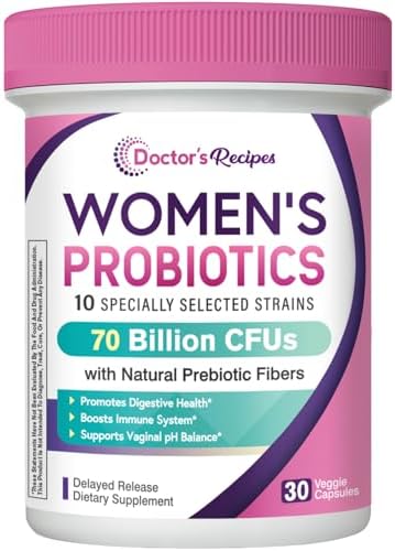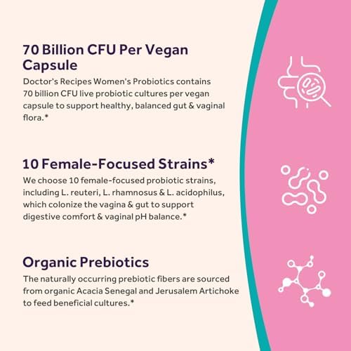 Doctor's Recipes Probiotics for Women, Organic Prebiotics and Probiotics for Digestive Health, Vaginal Health, 70 Billion CFU, 10 Strains, Shelf Stable, 30 Capsules