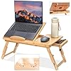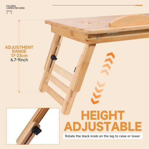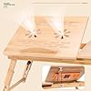 Adjustable Bamboo Laptop Desk with Cooling Fan, Foldable Bed Tray for Breakfast, Writing, and Drawing, with Tilting Top and Drawer, Portable Lap Desk for Bed, Sofa, and Floor.