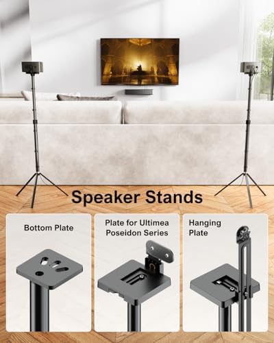 • Compatible with Various Speakers: The Steady 300 surround sound speaker stand offers three mounting options for speakers with bottom or rear screw threads or keyhole mounts. The package includes adjustable height and width components to fit different speaker sizes. It is compatible with the ULTIMEA Poseidon series, Sony(HT-S40R), LG(S40TR, S80TR), VIZIO(SV510X-0806, SL512X-0806, P514a-H6), JBL(JBL Bar 1300, JBL Bar 9.1), Polk Audio(MagniFi Max AX SR), Roku Wireless Speakers, RAINEVERRY(Raineverry 5.1), etc. Note that it does not support the ULTIMEA Nova and Aura series