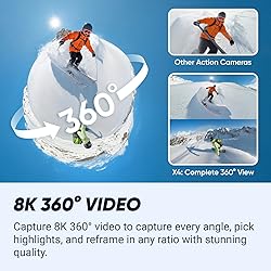 IMMERSIVE 360 VIDEO - The 8K era is here. Insta360 X4 delivers 360° video in stunning 8K or 5.7K60fps! Use Active HDR to keep shots color accurate too, even in action scenarios. SIMPLE, EASY REFRAMING - With Insta360 X4, get out there and shoot, not having to worry about lining up a shot. Shoot first, then reframe easily after, all in the AI-powered Insta360 app. INVISIBLE SELFIE STICK EFFECT - The signature third-person Insta360 shot, a specialty of 360 cameras. Immerse your viewers in obstruction-free 360° video, just like you're using a drone or as if you have your own film crew.(*Invisible Selfie Stick sold separately.) 4K & 170° MAXVIEW - X4 can also be used as a wide-angle 4K action camera at a whopping 4K60fps, or get super wide views with the incredible 170° MaxView at 4K30fps. ULTRA STABLE FOOTAGE - FlowState Stabilization and 360° Horizon Lock deliver smooth, level shots, no matter how intense the action is. SMARTER, RUGGED BUILD - X4 withstands bumps and hardcore action like a pro. The lens guards are also upgraded, now easier to apply and remove on the go. COLD RESISTANT & WATERPROOF - X4 can handle temperatures as low as -4ºF (-20ºC) with ease. You can also take X4 down to 33ft (10m) without a dive case or 164ft (60m) with the Invisible Dive Case. IMPROVED 2290MAH BATTERY, FAST CHARGING - Compared to Insta360 X3, X4 offers 67% longer run time. Capture up to 135 minutes on one charge, with fast charging to get back out there faster than ever. 2.5" GORILLA GLASS TOUCHSCREEN - X4 is equipped with an ultra bright 2.5" touchscreen with strong Corning Gorilla Glass. Rock solid protection that's easy to use and control.