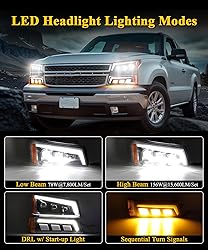 [Multi Functions] LED Headlights, Start-up Lights, High/Low Beam, DRL, Side Reflector (NO LED), Side Marker, Sequential Turn Signals. [Package Content] a full set of LED Headlights Assembly Kit for Silverado/Avalanche 2003-2006 [Z-Shaped Cutoff Line] Not blinding oncoming traffic. Sharp cutoff edge, creates a clear boundary between light and dark. Enhanced night-time visibility for safer driving in all conditions [DOT Approved] Real DOT SAE Approved. Legal on the road. [High-intensity Led Chip] Utilize the latest optic technology. Brighter Illumination. Energy Efficiency. Lifespan Lasts up to 50,000 hours. Outlast halogen headlights by up to 10x - No replacements for years [Plug N Play Installation] Direct replacement headlights with no modifications needed. Includes all mounting hardware and resistors to prevent hyper flash. If any lights don’t work, flip the plug 180° and reconnect it. The instructions are included in the box, please read them first for a smooth installation process [Compatibility] Replacement for 2003-2006 Silverado 1500 2500 3500 & HD Models, 2007 Silverado 1500 2500 3500 & HD Classic (Classic Models ONLY), 2003-2006 Avalanche 1500 2500 (Except Factory Body Cladding). Weather-resistant design for long-term use