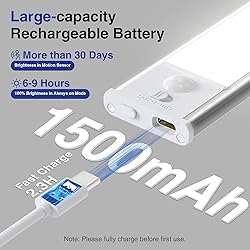 Motion Sensor Activation In Dark: Our 12 inch 54 Led cabinet lights feature advanced motion sensors that automatically illuminate when detecting movement at night, providing you with a convenient and safe lighting solution (NOTE: When charging, the Auto mode cannot be used) Fast Charging & 1500mAh Battery: Enjoy 2.3 hour quick charging via included USB Type C. Choose the always-on mode for continuous lighting with a 6-9 hours standby time, last up to 7-25 days on motion sensor mode, don't need to frequent recharging(The sensing distance of the product is 3M/10FT, and the sensing angle is within 120 degrees) Stepless Dimmable & Adjustable 3 Color Temperature: Customize your lighting experience with adjustable brightness from 20% to 100% and 3 color temperatures ranging from 3000K to 6000K. Enjoy eye-friendly illumination while enhancing the ambiance Easy to install: No need for an electrician! built-in strong magnet to stick on any ironwork, or you can use the included adhesive tape to tape and iron sheet to stick on counter non iron surface. You can the move the closet light anytime Versatile Applications: Perfect for various settings including kitchens, closets, stairways, and more, our cabinet lights enhance visibility and convenience in everyday life