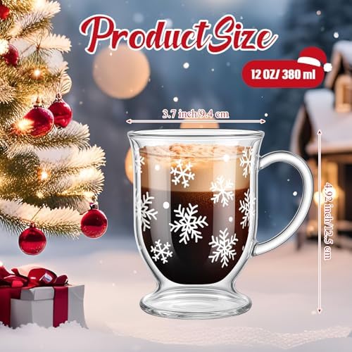 Features: Each glass coffee mug in the set comes with a good 12 oz capacity, allowing for just the right amount of your favorite hot drink without frequent refills that can interrupt your cozy moments. These coffee glasses are equipped with convenient handles, ensuring safe and comfortable handling even when the beverage is hot. This reduces the risk of accidental slips or burns. Specifications: Material: glassColor: clearSize: about 4.92 x 3.7 inches/ 12.5 x 9.4 cmCapacity: 12 oz/ 380 mlPackage includes: 6 x Christmas coffee glassesNotes: Manual measurement, please allow slight errors on size. The color may exist a slight difference due to different screen displays. Please handle these glasses gently to avoid breaking them.