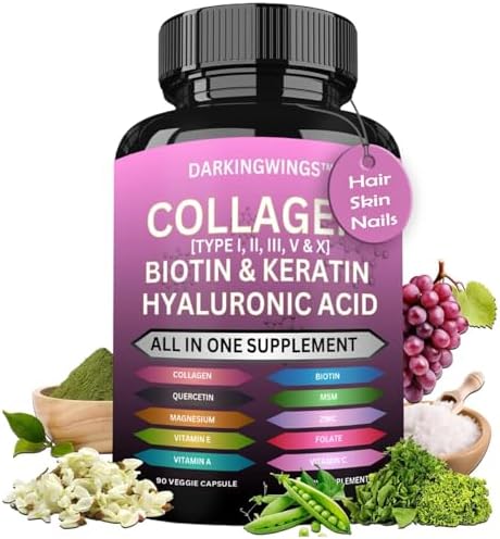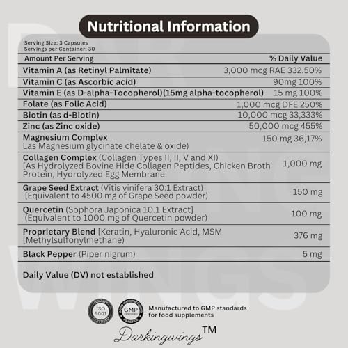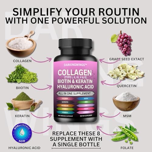 - Packed with a potent blend of Collagen with Hyaluronic Acid, Biotin, Keratin, Magnesium, Zinc, Quercetin, Grape Seed Extract, it offers an abundance of mineral and vitamin benefits. Say goodbye to the clutter of countless supplements in your cabinet and make room for a single solution. Darkingwings presents a groundbreaking 14-in-1 beauty formula, combining collagen biotin, keratin, hyaluronic acid, with several other minerals and vitamins.
